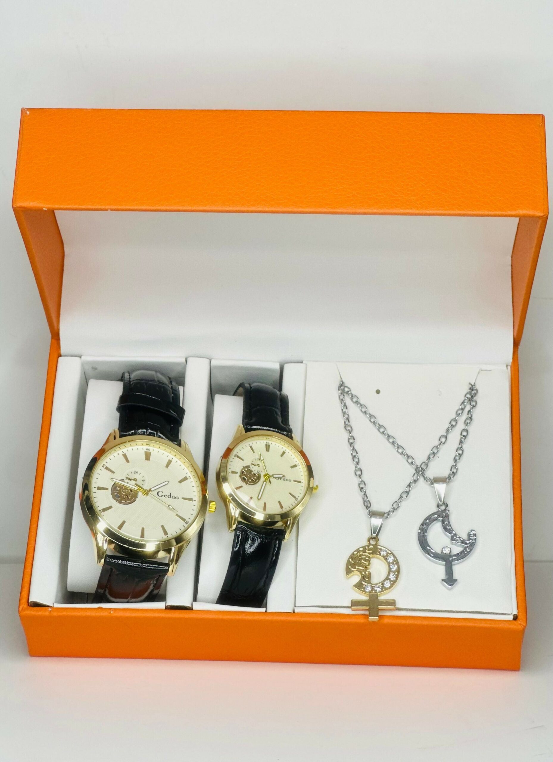 • Includes a pair of matching analog watches with semi-skeleton dials and gold accents